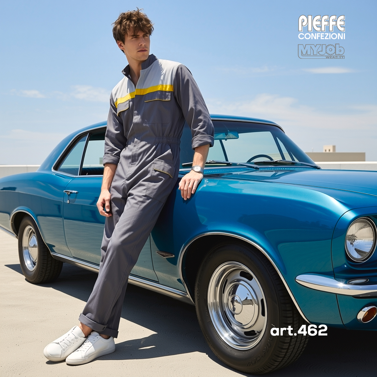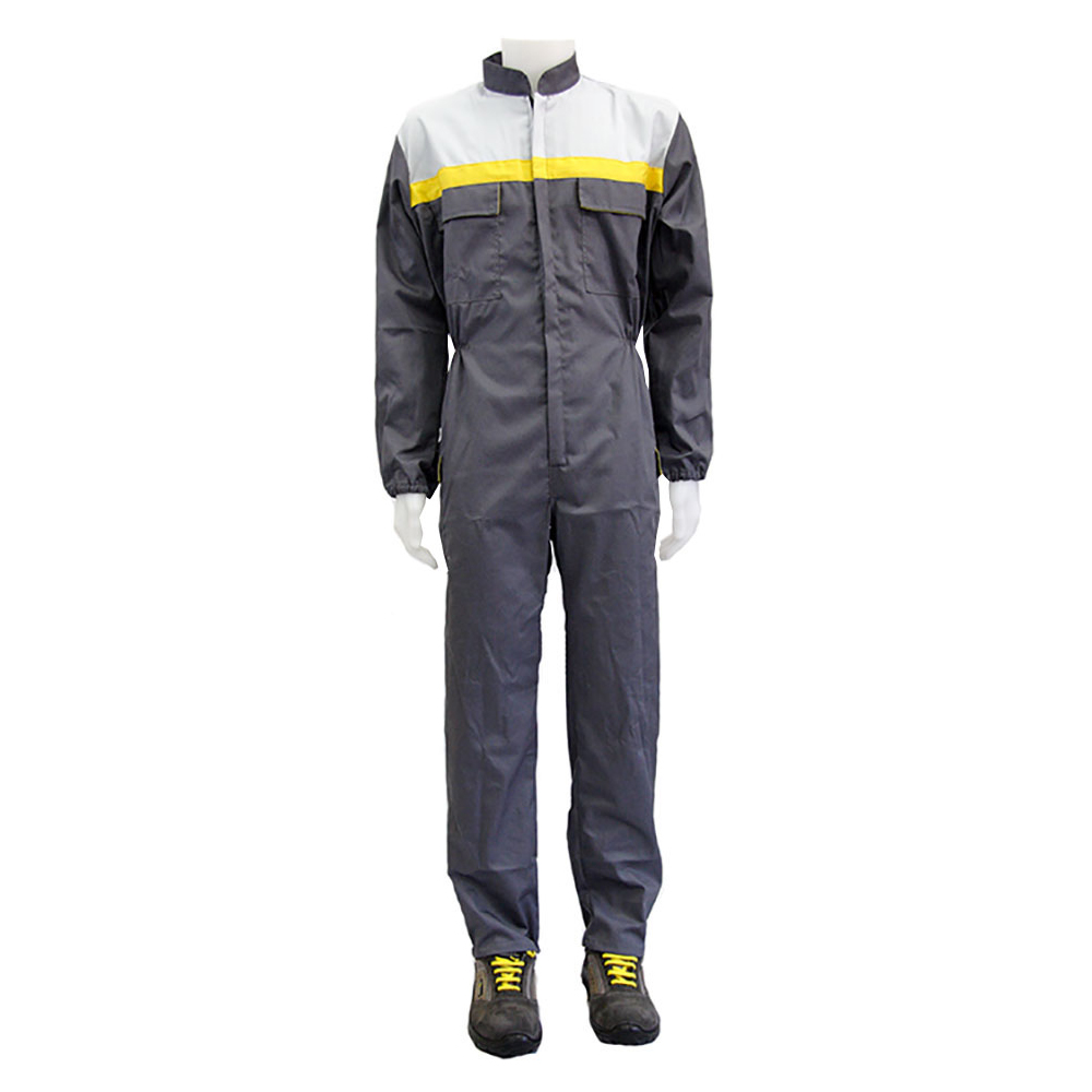 Tuta intera 462 collo alla coreana, chiusura con cerniera coperta, elastico ai polsi, carrè anteriore e posteriore a contrasto, banda anteriore a contrasto, soffietti posteriori laterali a contrasto, due taschini chiusi con pattine e velcro con interno a contrasto, elastico posteriore ed in vita, due tasconi laterali chiusi con pattina e velcro con interno a contrasto.